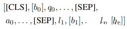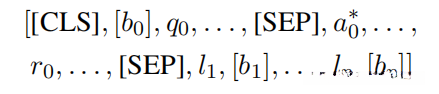其中,[b0]是整个输入图像的一个边界框,q0是问题标记,a0答案标记,A0*正确答案标记,r0理由的标记。我们将O中的第一个带有类标签的p边界框附加到序列的末端(在我们的实验中,我们使用p=8),对于Q、A、R中引用的对象,我们预先准备类标签标记(即[bi]变成li,[bi])。我们将二进制标签l分配给每个实例,以表示答案或基本原理选择是正确的。