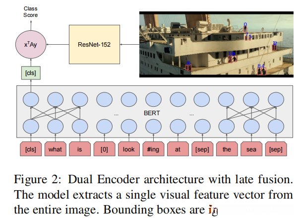 我们评估两种主要结构:双编码器,一种晚融合结构,图像和文本分别编码,答案分数作为一个内积计算;以及完整的B2T2模型,一种早融合架构,视觉特征和输入词标记嵌入在相同的层次上。