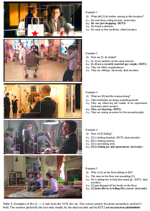 在我们的实验中,我们发现文本标记和对象视觉特征之间的早期融合是获得改善VCR的最关键因素。我们发现,我们在模型的输入中包含的视觉对象特征越多,模型的性能就越好,即使它们没有明确地共同引用文本,而且对图像中对象的位置特征也很有帮助。我们最终发现,当VCR模型从概念标题的预训练中初始化时,它们可以更可靠地进行训练,这是一个包含约300万张图像和标题的公共数据集。通过这些建模改进的结合,我们获得了一个新的视觉问答模型,该模型实现了VCR上的最先进水平,相对于最好的发布和记录的模型,错误率降低了25%以上。