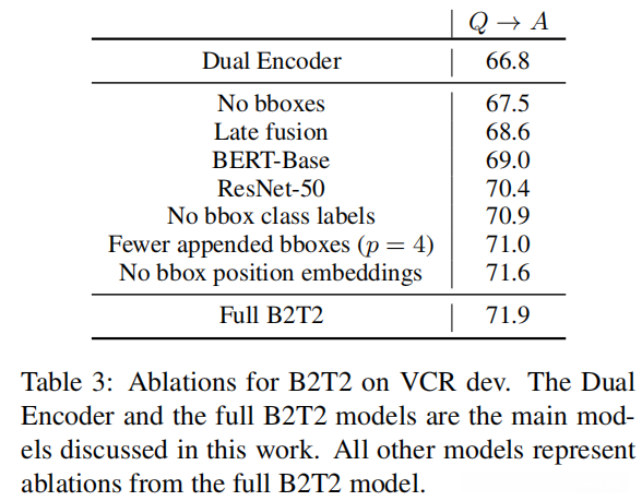 我们还用双编码器模型演示了竞争结果,即使忽略了对图像边界框的文本引用,也能匹配VCR数据集上的最先进的结果。然后,我们展示了我们的双编码器模型可以通过深入合并从整个图像和边界框中提取的文本嵌入视觉特征来大大改进。最后,我们展示了用掩模-lm损失对概念标题的深度模型进行预训练,可以产生一个小的额外改进以及更稳定的微调结果。