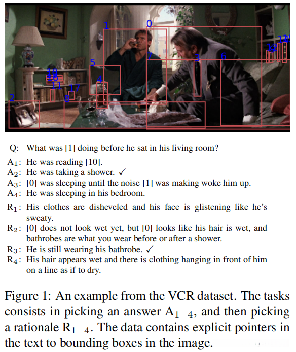 图1显示了一个来自VCR基准测试的一个说明性示例。视觉常识推理很适合测试丰富的多模态表示,需要更多的建模能力进行语言理解。