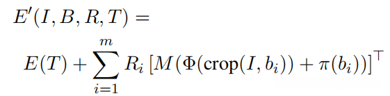 其中M是一个学习到的h×d矩阵,Φ(crop(I,bi))表示裁剪图像I到边界框bi,然后提取大小为d的视觉特征向量,π(bi)表示将bi的形状和位置信息嵌入到大小为d的向量中。