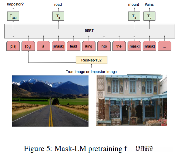 在VCR训练之前,我们使用Mask-LM预训练技术对图像和标题对进行预训练,如BERT中使用的预训练技术。在预训练中使用的设置如图5所示,其中模型在填充掩码时使用图像作为附加上下文。