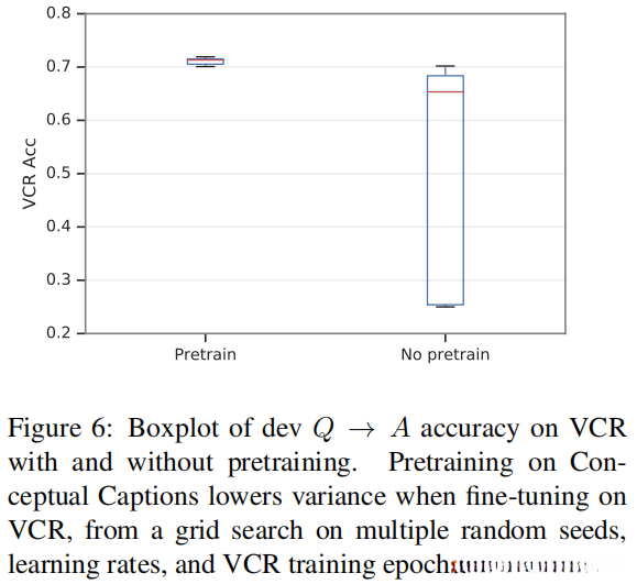 预训练:我们发现,从预训练中获得的性能改进相当小,准确率约为0.4%,但从预训练的模型中初始化大大减少了结果的方差。我们在图6中,在3.5节中描述的学习率、随机种子和训练时代的网格中展示了这种效应。