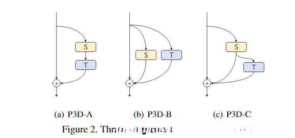 P3D Blocks的灵感来源于ResNet,P3D Blocks用于代替ResNet的Residual Units。为了研究空间维度(S)上的2D卷积核和时域(T)上的1D卷积核并联还是串联效果好,设计了三种结构如上图所示。