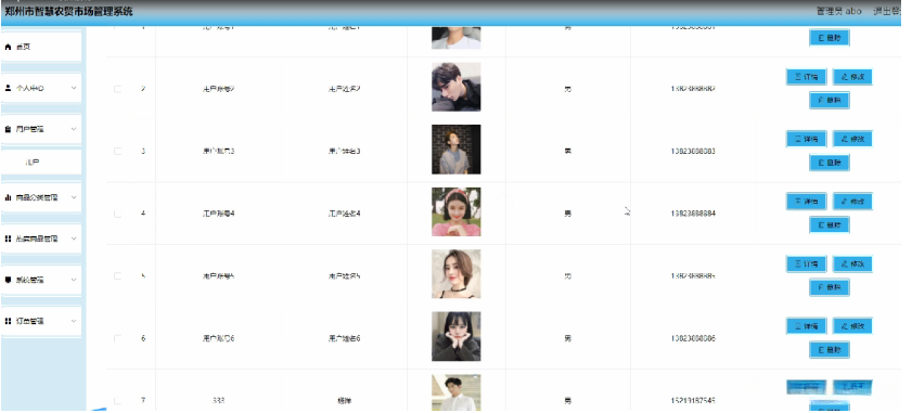 用户管理系统,在用户的管理界面中可以查看和管理索引信息、用户名或账号信息、真实姓名或昵称设置、个人头像设置以及性别等基本信息,并支持查看详细信息、编辑数据内容以及删除记录操作。