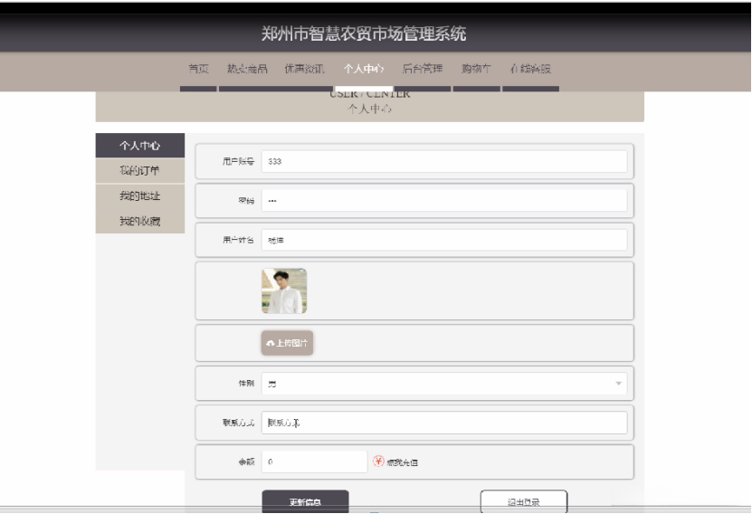 个人中心,在个人中心页面中录入用户的账号信息(包括用户名名)、密码、用户名名、性别、联系电话以及账户余额等各项数据后完成信息更新操作;同时支持详细的订单管理、地址管理和收藏商品的个性化服务。如图5-4所示