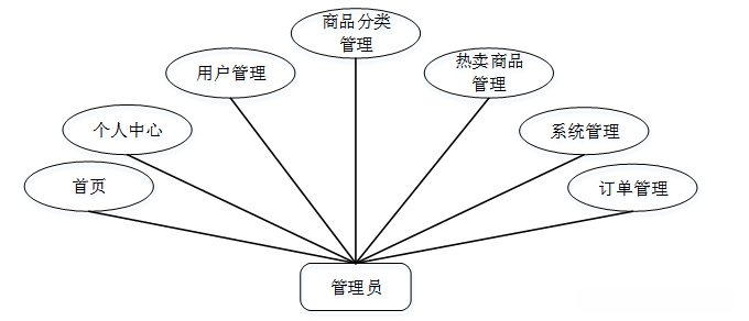 当管理员登录系统后,默认权限下可执行的主要功能区包括:首页界面、个人中心界面、用户信息维护区(包含个人信息配置)、商品类目管理和热销商品展示区、系统维护区(包含基础参数配置)以及订单处理功能等。其中的管理员用例图见附图3-1。