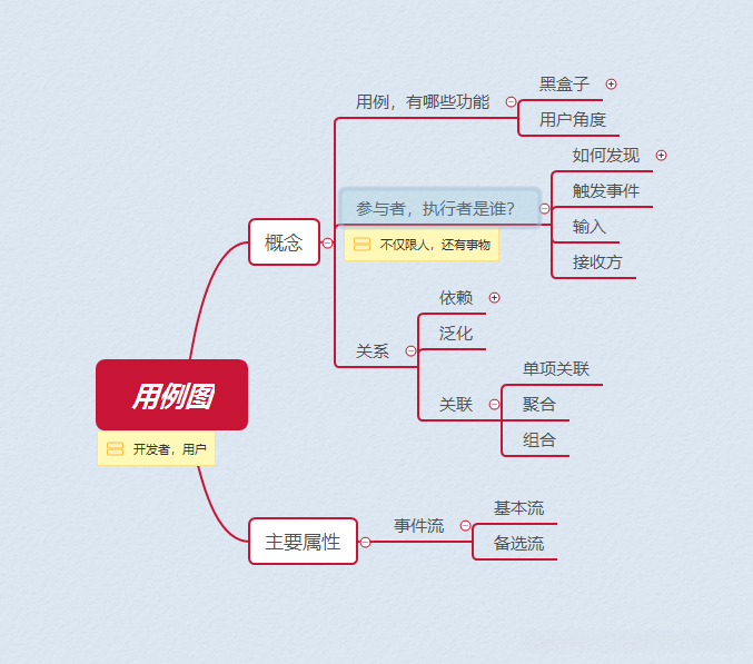 用例图是从用户角度描述系统功能,是用户所能观察到的系统功能的模型图,用例是系统的一个功能单元。用例图描述的是从一个外部的观察者的视角对系统的印象,强调的是这个系统是什么而不是这个系统怎么工作。用例图与情节仅仅相关的,情节scenario/səˈnærioʊ/是指当某个人与系统进行互动时发生的情况。