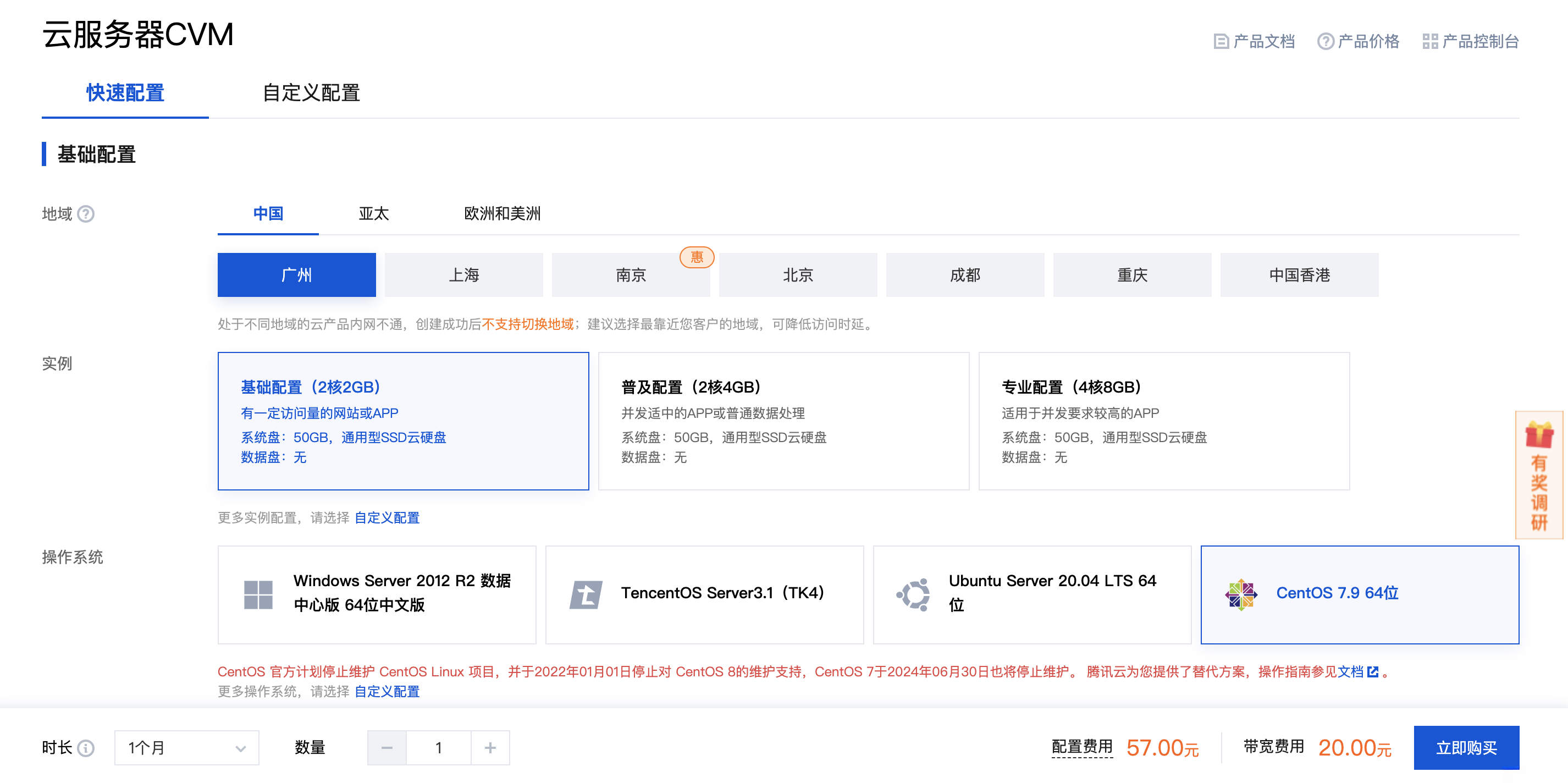 3.选择自己需要性能配置,我选最基本的配置,系统选CentOS7.9 64位,其他保持默认。付款购买。