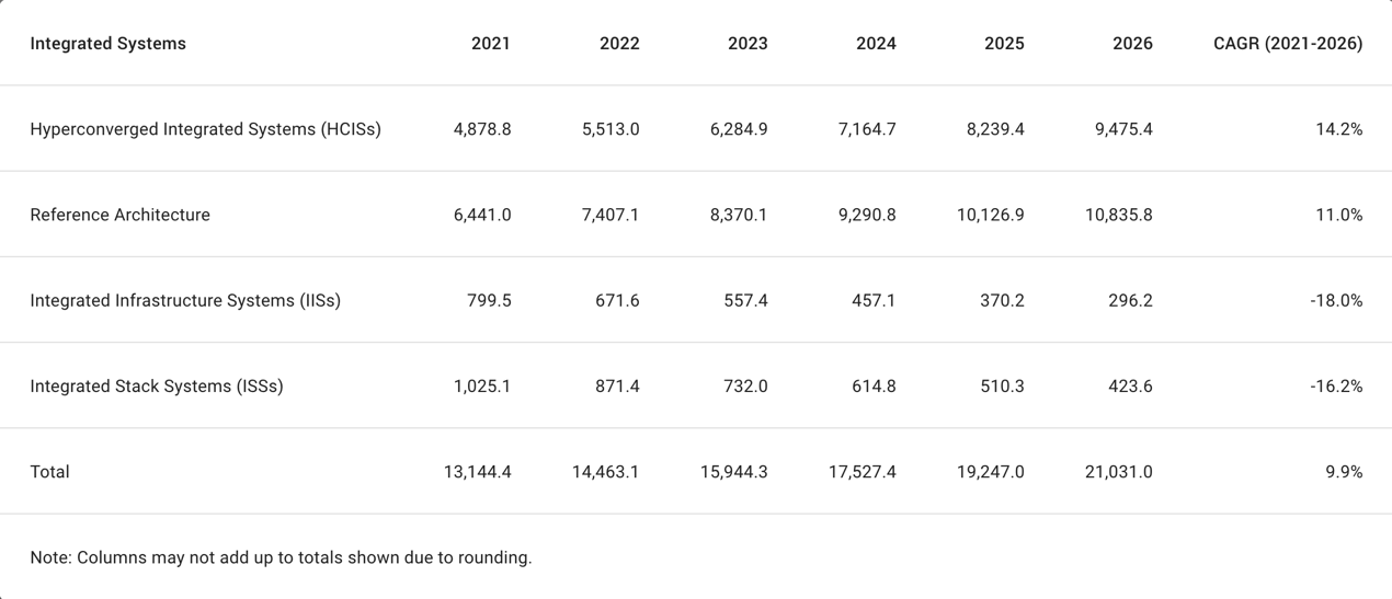 近日,Gartner公布了《全球集成系统市场预测分析》(Forecast Analysis: Integrated Systems, Worldwide)报告,该报告指出,基于现有数据计算,2021年全球超融合集成系统(HCISs)的总收入约为50亿美元左右,展望未来五年,至2026年这一数字预计将增至接近95亿美元,而过去五年间的平均年复合增长率则达到了13%以上,使其在该细分市场领域的发展速度位居首位