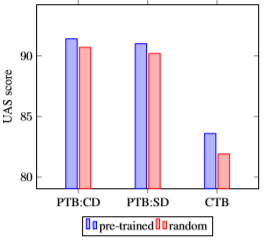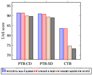 这个词性和现有的依赖关系在作为输入时有其价值,在自然语言处理中体现为有意义的信息来源。然而现有的词性对于捕捉这些依存信息而言已经足够充分,并不需要额外添加现有依存关系这一特征来进一步提升性能。这是因为词语本身的形态已经包含了丰富的语法信息与语义关联内容。