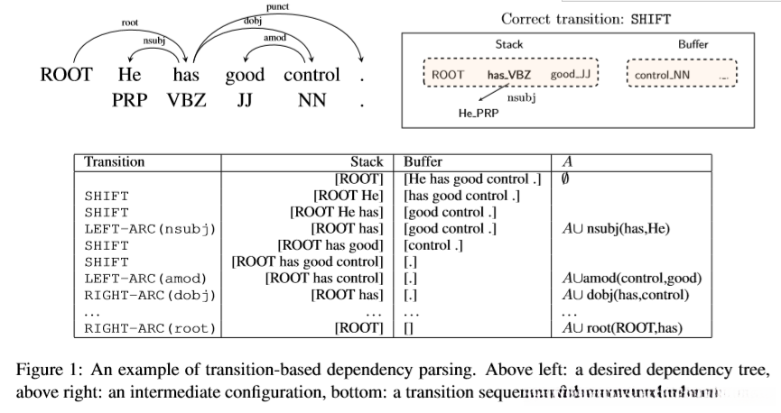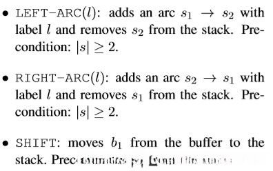 2. 状态configuration: c=(s,b,A),s代表栈,b代表缓冲,A代表当前已经画好的依赖弧集合;