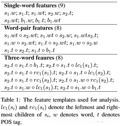 栈中的前三项及缓冲区;在栈中的前两个元素的第一位和第二位分别存在左依存与右依存;对于这些元素而言,在其左侧还有左侧依存,在右侧则有右侧依存。