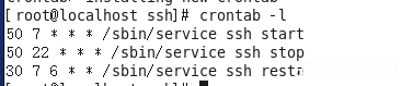 c. 配置root用户的计划任务安排。每天早晨七点五十分定时启动SSH服务,在每日晚上十点五十分停止运行;每周六早晨七点三十分执行SSH服务的重启操作。