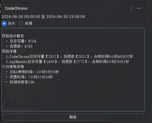 直观便捷的操作界面:CodeChrono是一款专为IDEA生态系统量身定制的插件,在设计上强调了最简明扼要且易于操作的核心理念。它完美融入你的开发环境,在无需学习任何额外配置的情况下就能快速上手使用。通过查看相关统计数据即可随时掌握工作状态,并能轻松了解自己的开发进度和资源管理情况。