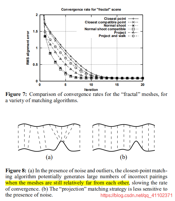 对于不规则地形(fractal landscape),normal shooting算法表现最佳。最近点匹配算法在初始距离较大时,对噪声数据敏感,且会产生较多的误匹配现象,具体可见图7和图8的实验结果。