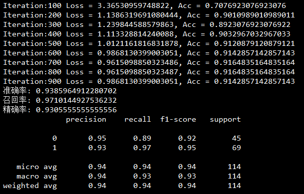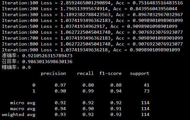 最终实现了在训练集进行训练,并在测试集上进行评估Logistic模型的功能。该功能的具体实现细节可见于附录中的代码清单14-8部分。研究团队特别设定了解决方案中的迭代次数为1000次,并将学习率固定为0.2这一参数值。同时编写了如代码清单14-7所示的main函数作为整个脚本的主要入口。