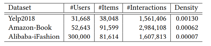 我们遵循中描述的相同策略,以7:1:2的比例将交互划分为训练、验证和测试集。对于测试集中的用户,我们遵循全排名协议来评估Top-K的推荐性能,并报告平均Recall@K和NDCG@K,其中K=20。