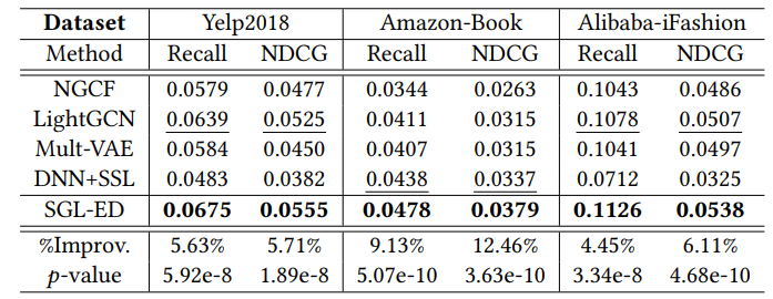 - DNN+SSL是Amazon-Book上最强的基线,显示了SSL在推荐中的巨大潜力。令人惊讶的是,在其他数据集上,DNN+SSL的性能比SGL-ED要差得多。这表明,在ID嵌入上直接使用SSL可能是次优的,比图表示上使用要差。此外,我们还进行了显著性验证,p值<0.05表明SGL-ED比最强基线的改进是显著的。