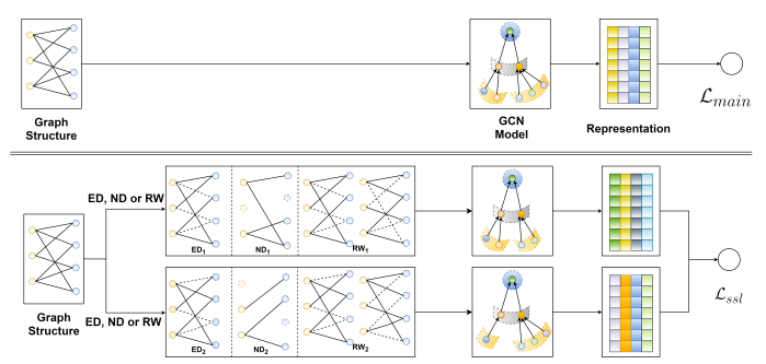图1:SGL的总体系统框架。上层显示了监督学习任务的工作流程,底层显示了SSL任务的工作流程,并在图结构上进行了扩充。