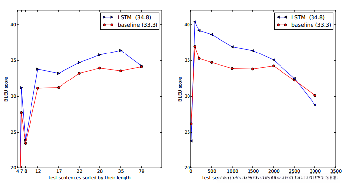 左图展示了我们系统作为长句子函数的性能,其中x轴表示测试句子按照长度排序的结果。观察结果显示,对于长度小于35的句子,LSTM模型的得分显著高于基准模型。右图展示了LSTM在句子长度逐渐缩短时的性能,其中x轴表示测试句子按照平均词频排序的结果。分析结果表明,对于词频排名在2500之前的词汇,LSTM模型的性能优于基准模型。