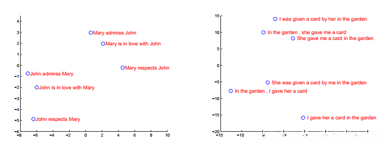 b、我们的模型能够将一个词序列转换为一个固定维度的向量。该图表明,表征物对于词序是敏感的,但对于主被动语态则不敏感。
