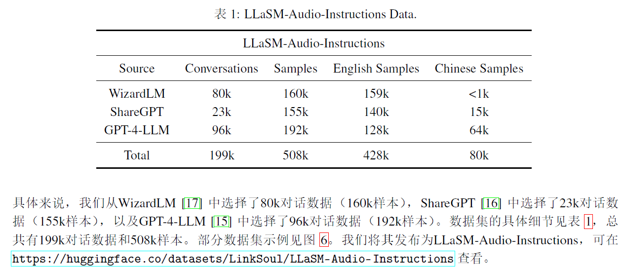 训练过程分为两阶段,第一阶段,使用公开的ASR数据集进行模态适应预训练,语音编码器和大语言模型冻结,仅训练模态适配器以对齐语音和文本嵌入。在这个阶段,由于大部分模型参数保持冻结,仅模态适配器的少量参数被训练。第二阶段,使用跨模态指令数据训练,语音编码器被冻结,而模态适配器和语言模型的参数进行更新,进行跨模态指令微调,LLaSM-Audio-Instructions指令数据集。从GPT-LLM,ShareGPT,WizardLM中挑选,通过文本转语音技术生成大量对话音频数据,总计包含199000个对话,其中包含80000个中文音频样本和428000个英文音频样本。