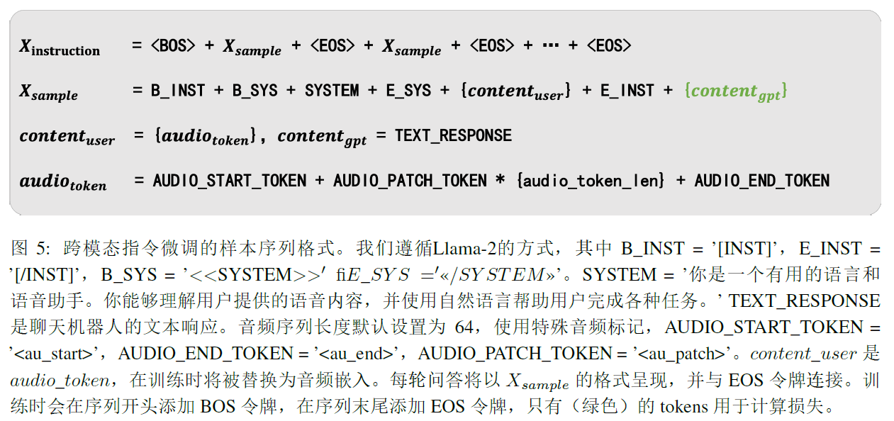 跨模态指令微调。这个阶段,仅冻结模态编码器,训练模态适配器和LLM,通过微软Azure的文本转语音api将人类提出的问题转成音频数据,训练目标是预测聊天机器人的响应,一轮问答会被处理成一个多模态序列Xsample,多轮问答则通过EOS结束符进行连接,如下图所示: