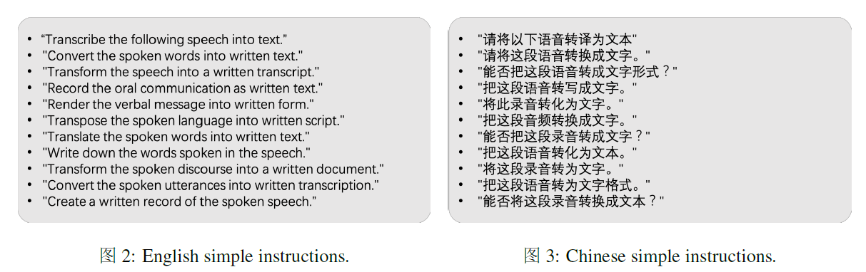 预训练阶段。在这个阶段,模态编码器和LLM保持冻结。为了使LLM理解模态编码器的音频嵌入,使用公开的语音识别数据训练模态适配器,使文本和音频嵌入对齐。语音识别数据的数据样本(音频,文本)格式化为(简单指令,音频,文本)。