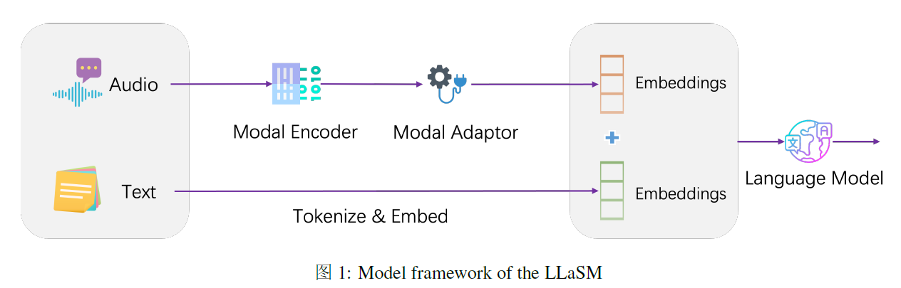级联方法使用ASR将语音输入转化为文本输入,语音到文本会导致信息损失,本文提出LLaSM,一个具有跨模态对话能力的大型语音与语言模型,能够理解和遵循语音与语言指令,借鉴LLaVA,利用预训练的语音模态编码器和大语言模型,使用Whisper作为语音编码器,将语音信号转化为嵌入,然后,一个模态适配器学习将语音嵌入与大模型的输入文本嵌入对齐,将语音嵌入和文本嵌入串联起来形成交错序列输入到大语言模型中微调。