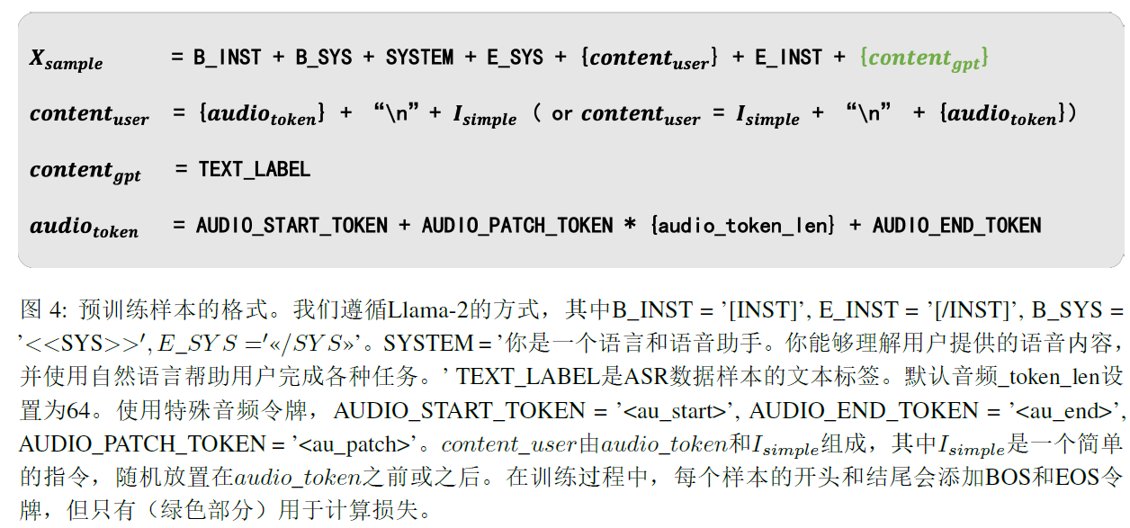 预训练多模态序列的统一格式如下所示:每个数据样本被格式化Xsample,然后将文本序列中的音频片段嵌入替换为模态适配器的音频嵌入,训练目标是预测每个数据样本的文本标签。