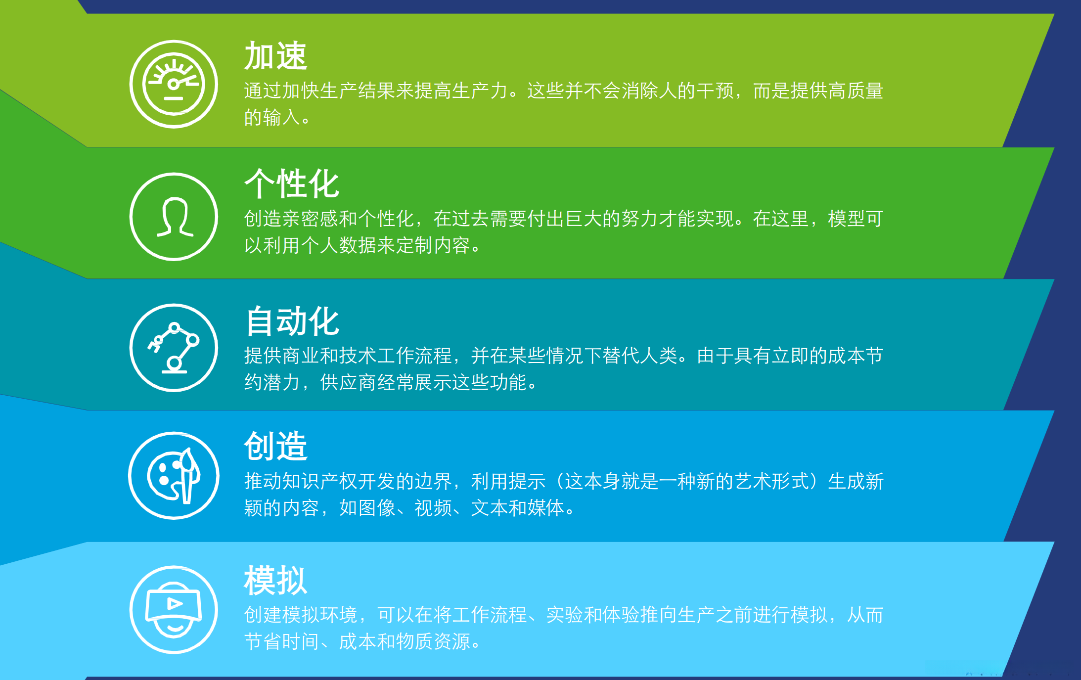- 工作效率提升 :生成式AI能够自动化处理大量的数据和信息,为企业节省时间和人力资源,使企业能够专注于更有价值的任务。