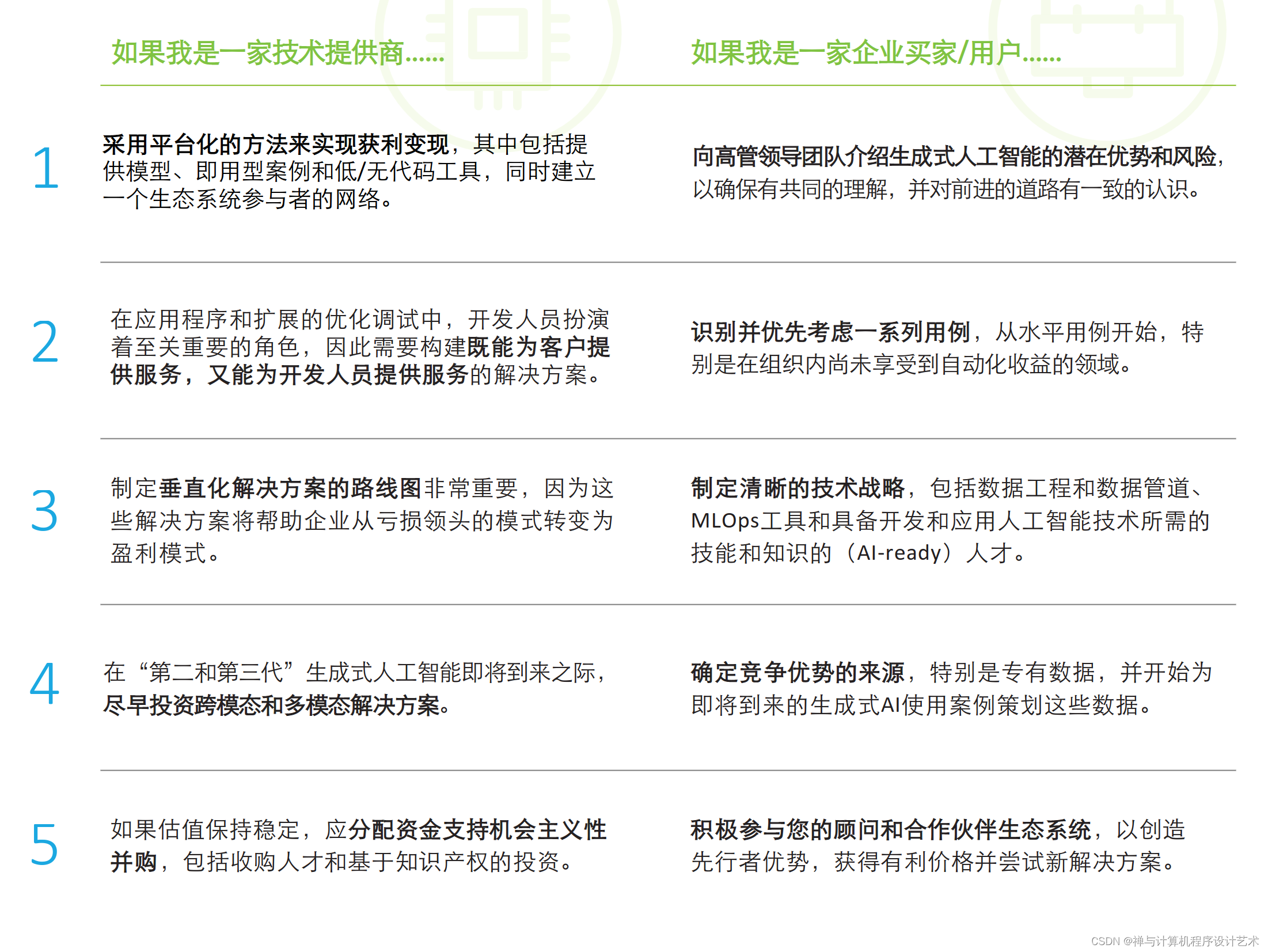 - 投资于生成式人工智能技术:企业应积极投资于生成式人工智能的研发,以保持竞争优势。