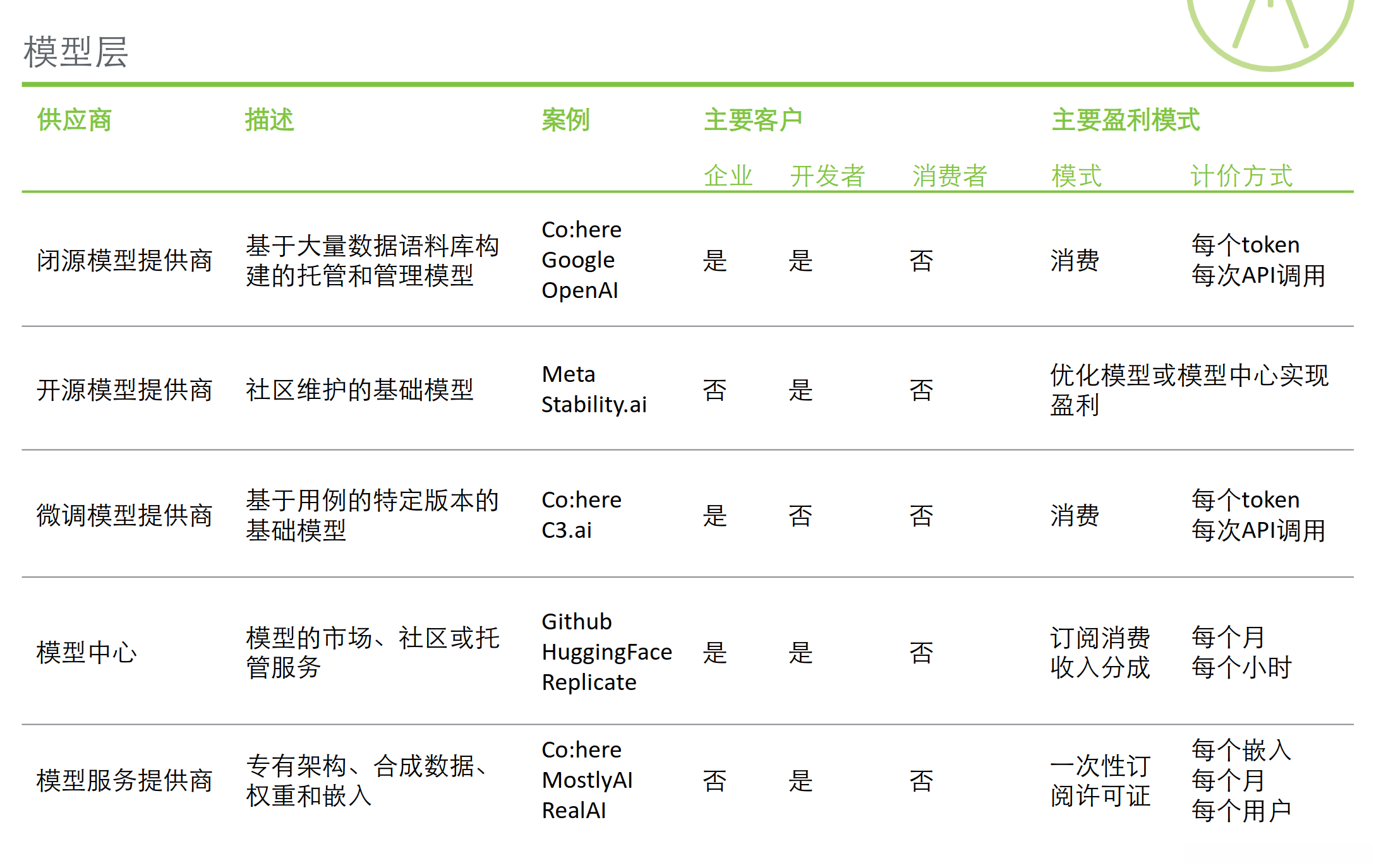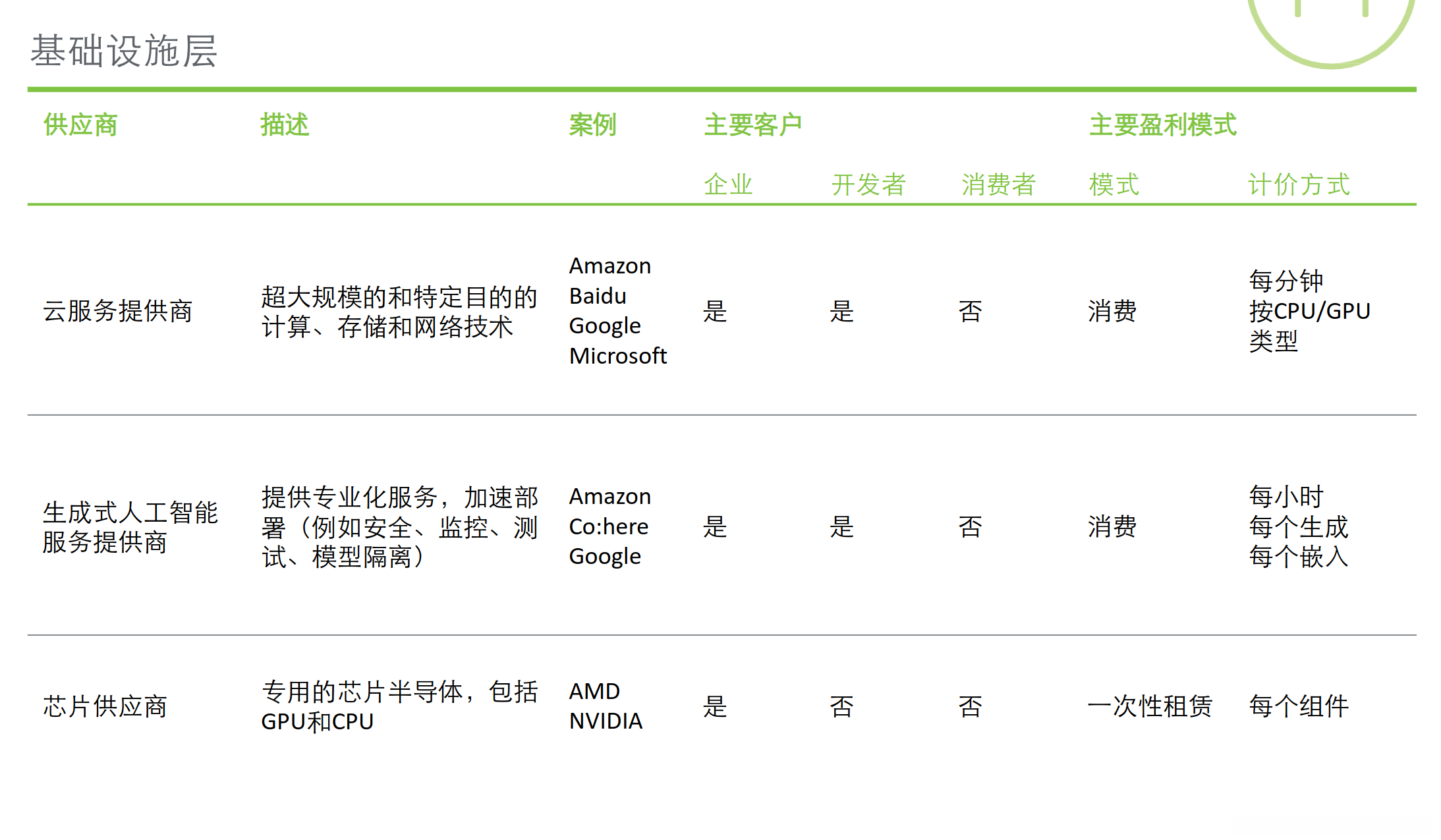 基础模型(Foundation Model)是区别生成式人工智能技术栈和之前人工智能的关键。 基础模型是斯坦福大学基础模型研究中心创造的术语,它是一个在广泛数据集上预先训练的机器学习模型,可以用于解决一系列问题。就像微软的Win32为开发人员提供API来访问底层的硬件和操作系统功能,以及NVIDIA的CUDA允许图形密集型应用程序(例如游戏引擎)简化访问GPU资源一样,模型层的设计旨在将雄心勃勃的应用程序开发人员与优化硬件连接起来,从而帮助加速和普及生成式人工智能技术。