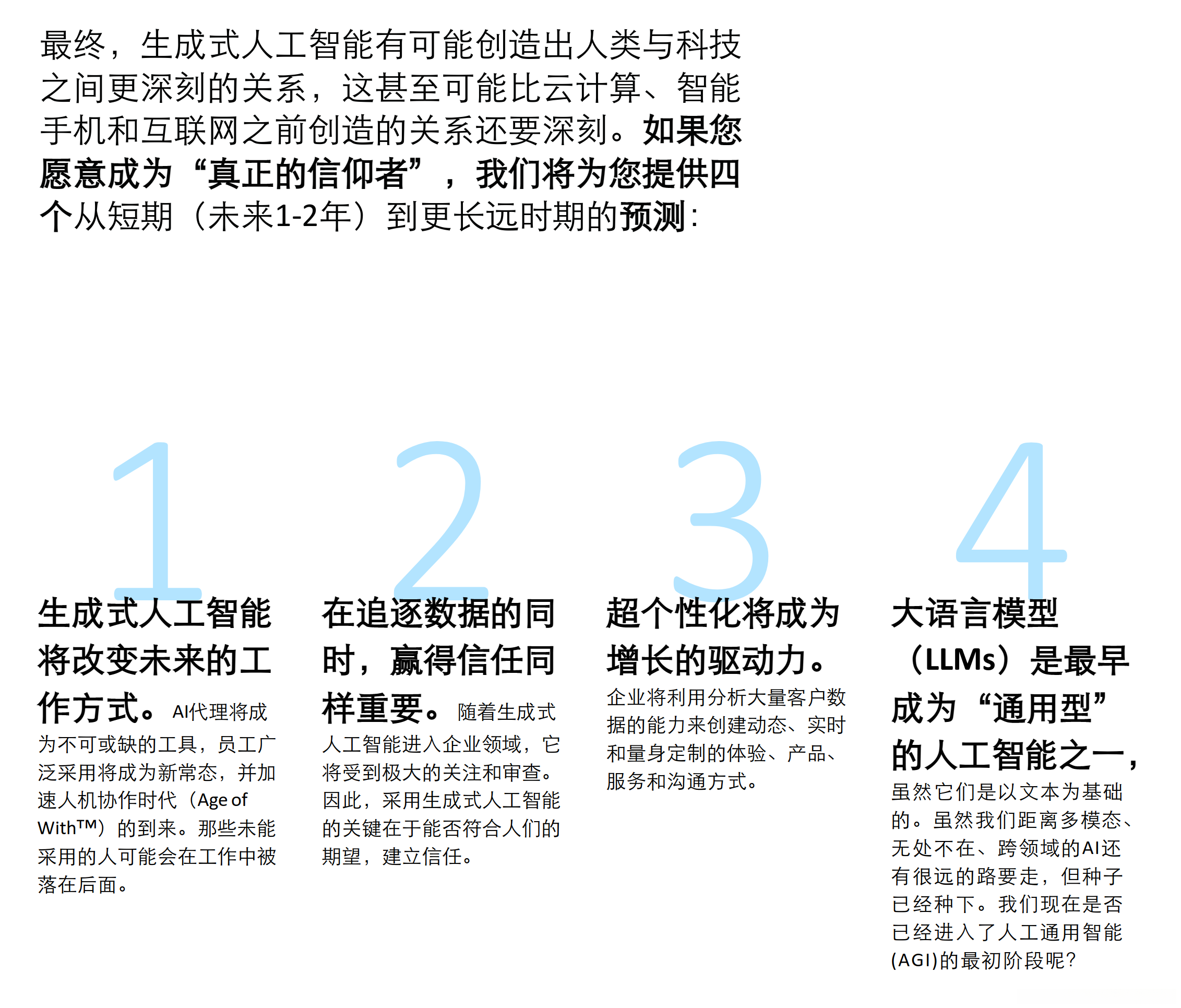 最终,生成式人工智能有可能创造出人类与科技之间更深刻的关系,这甚至可能比云计算、智能手机和互联网之前创造的关系还要深刻。如果您愿意成为“真正的信仰者”,我们将为您提供四个从短期(未来1-2年)到更长远时期的预测: