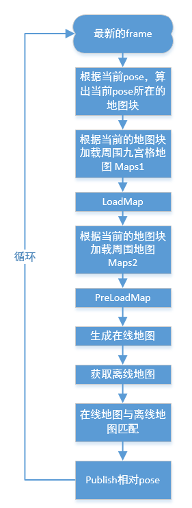 上图为实时加载离线地图并与在线地图匹配,输出相对位姿的流程图。