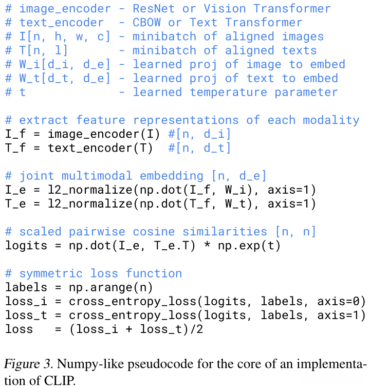 在图 3 中,包含了 CLIP 实现的核心伪代码。据我们所知,这种批量构建技术和目标首先作为多类 N 对损失 Sohn (2016) 在深度度量学习领域引入,并被 Oord 等人 (2018) 作为 InfoNCE 损失推广用于对比表示学习 ,并且最近被 Zhang 等人 (2020) 改编用于医学成像领域的对比(文本、图像)表示学习。