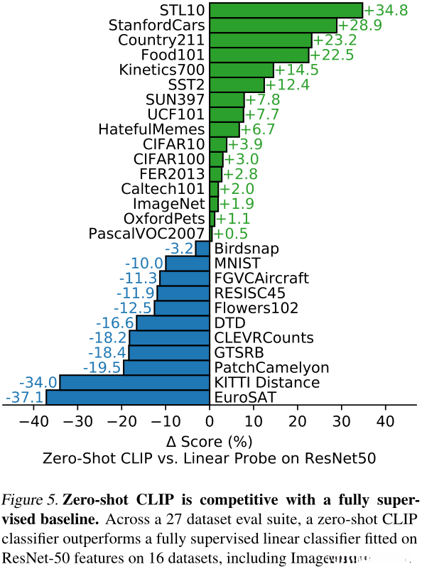 由于任务无关的计算机视觉零样本分类器的研究不足,CLIP 提供了一个有希望的机会来更好地理解这种类型的模型。在本节中,我们对 CLIP 的零样本分类器的各种特性进行了研究。作为第一个问题,我们简单地看一下零样本分类器的性能。为了将其置于上下文中,本文将其与一个简单的现成基线的性能进行比较:在规范 ResNet-50 的特征上拟合一个完全监督的、正则化的逻辑回归分类器。在图 5 中,展示了 27 个数据集的这种比较 。有关数据集和设置的详细信息,请参阅附录 A。