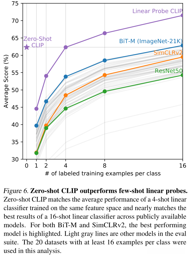 虽然将零样本性能与完全监督模型进行比较可以使 CLIP 的任务学习能力上下文化,但与少样本方法进行比较是更直接的比较,因为零样本是它的极限 。在图 6 中,可视化了零样本 CLIP 与少样本逻辑回归在许多图像模型(包括最佳公开可用的 ImageNet 模型、自监督学习方法和 CLIP 本身)的特征上的比较。虽然很直观地认为零样本的表现不如单样本,但我们发现零样本 CLIP 在同一特征空间上与 4 样本逻辑回归的性能相匹配 。这可能是由于零样本和少样本方法之间的重要区别 。