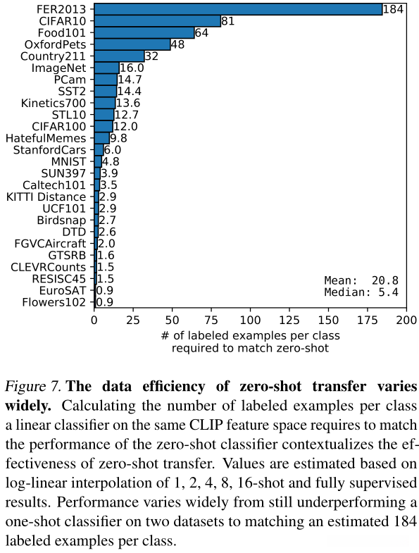 除了研究零样本 CLIP 和少样本逻辑回归的平均性能外,本文还检查了单个数据集的性能。在图 7 中,显示了对同一特征空间上的逻辑回归分类器 匹配零样本 CLIP 性能 所需的每个类别的标记示例数量的估计 。由于零样本 CLIP 也是一个线性分类器,因此这估计了此设置中零样本迁移的有效数据效率。为了避免训练数千个线性分类器,我们根据 1、2、4、8、16 样本(如果可能)的性能的对数线性插值估计有效数据效率,并在每个数据集上训练完全监督的线性分类器。我们发现零样本迁移在每个数据集上的效率差异很大 ,从每个类少于 1 个标记示例到 184 个。两个数据集 Flowers102 和 EuroSA T 的表现不如单样本模型。一半的数据集每个类需要少于 5 个示例,中位数为 5.4。然而,平均估计数据效率为每类 20.8 个示例。这是因为在 20% 的数据集中,监督分类器需要每个类有许多标记示例才能匹配性能 。在 ImageNet 上,零样本 CLIP 与在同一特征空间上训练的 16 样本线性分类器的性能相匹配。