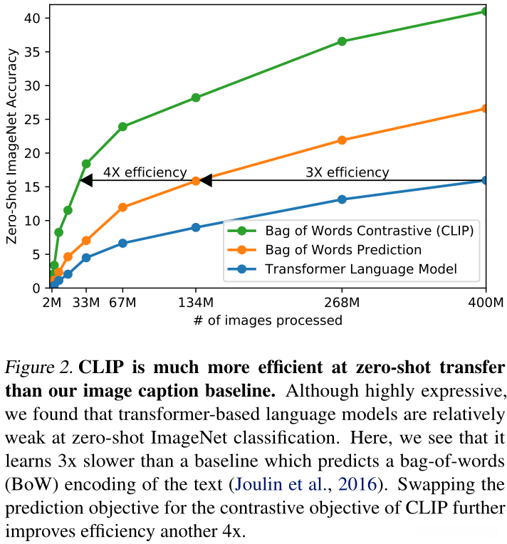 本文最初的方法类似于 VirTex,从头开始联合训练图像 CNN 和文本transformer 来预测图像的标题。然而,本文在有效扩展这种方法时遇到了困难。在图 2 中,本文展示了一个 6300 万参数的transformer语言模型,它已经使用了其 ResNet-50 图像编码器两倍的计算,学习识别 ImageNet 类 比 预测同一文本的词袋编码 的更简单的基线 慢三倍。