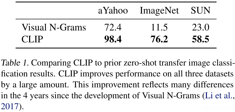 据本文所知,视觉 N-Grams (Li et al, 2017) 首先以上述方式研究了对现有图像分类数据集的零样本迁移。这也是我们所知道的唯一一项 使用 通用预训练模型 研究 零样本迁移 到标准图像分类数据集的工作,并作为上下文化 CLIP 的最佳参考点 。他们的方法学习了包含 142,806 个视觉 n-gram(跨越 1-5-grams)的字典的参数,并使用微分版本的 Jelinek-Mercer 平滑优化这些 n-gram,以最大化给定图像的所有文本 n-gram 的概率。为了执行零样本迁移,他们首先将每个数据集类名的文本转换为其 n-gram 表示,然后根据他们的模型计算其概率,预测得分最高的那个 。