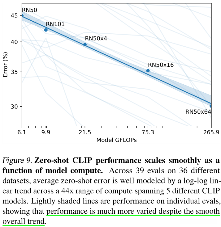 在过去几年中,深度学习系统的实证研究表明,性能是可预测的,它是训练计算和数据集大小等重要数量的函数 (Hestness 等人,2017 年;Kaplan 等人,2020 年)。迄今为止,GPT 系列模型在训练计算量增加 1000 倍的过程中证明了零样本性能的持续改进 。在图 9 中,检查 CLIP 的零样本性能是否遵循类似的缩放模式。本文绘制了 5 个 ResNet CLIP 模型在 36 个不同数据集上的 39 次评估的平均错误率,并发现在模型计算增加 44 倍的情况下,CLIP 具有类似的对数对数线性缩放趋势。虽然总体趋势是平稳的,但我们发现个别评估的表现可能更加嘈杂 。我们不确定这是否是由于子任务的个体训练运行之间的高差异(如 D'Amour 等人 (2020) 中所述)掩盖了稳步提高的趋势,或者作为某些任务的计算的函数,性能是否实际上是非单调的。