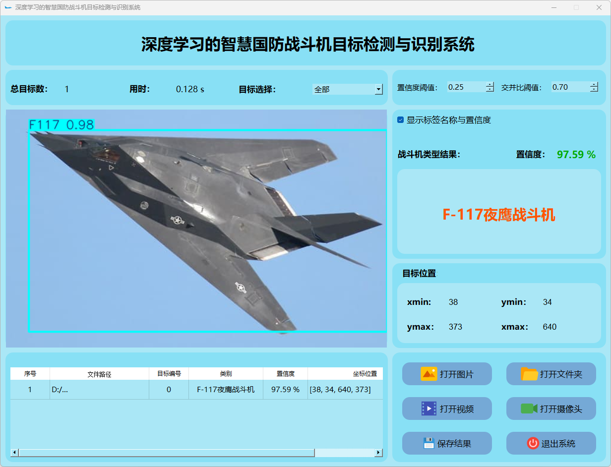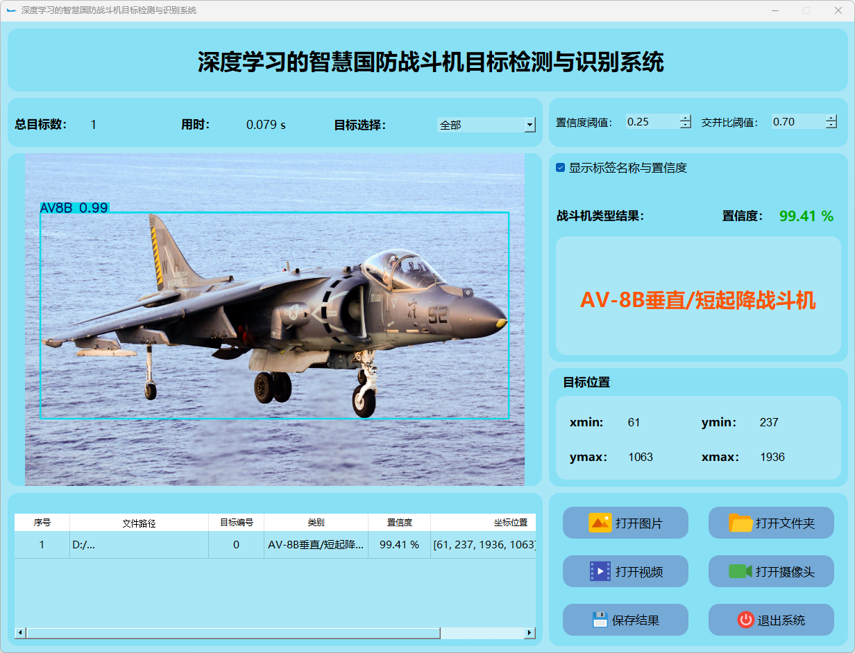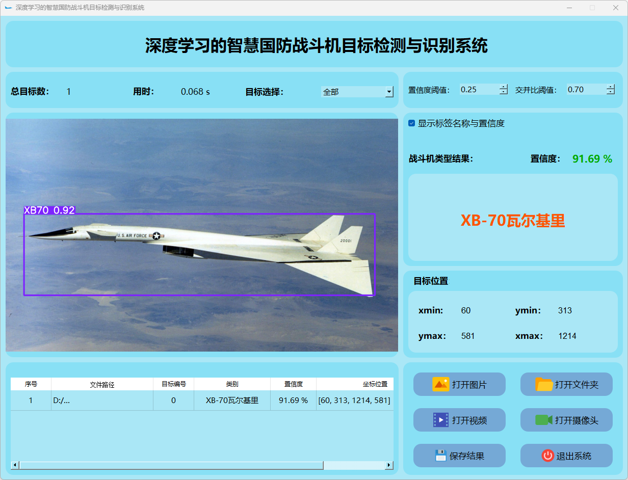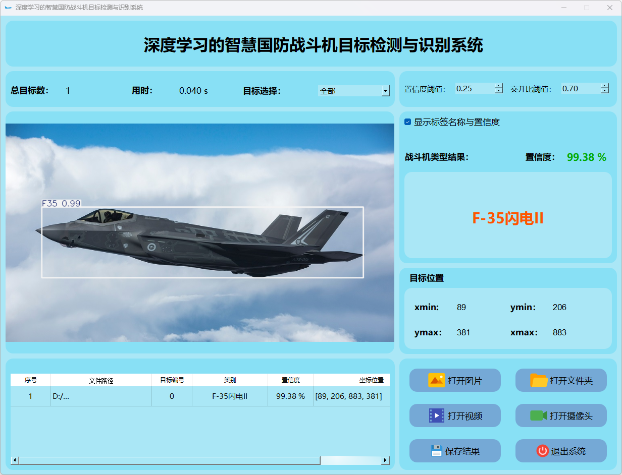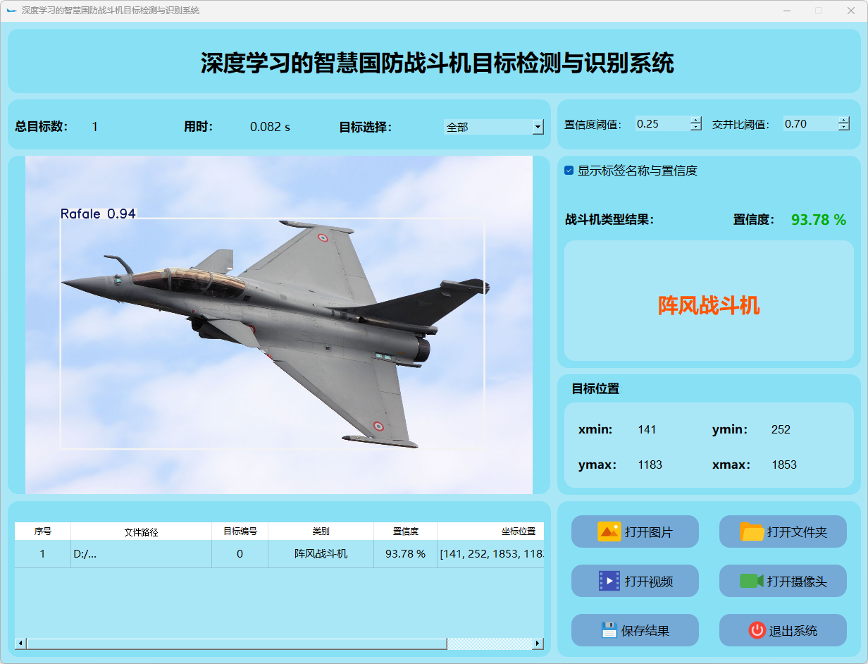 这个界面呈现了系统在视频帧中的多目标检测性能,并具备精确识别战斗机的能力;同时提供了详细的结果数据和置信度分数。