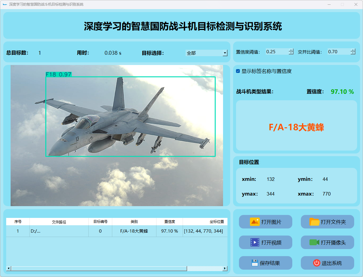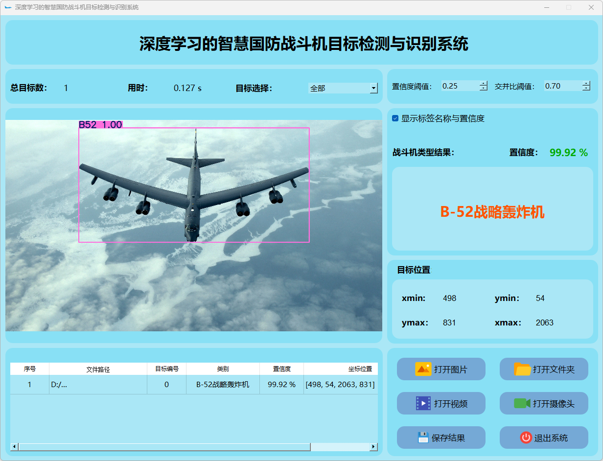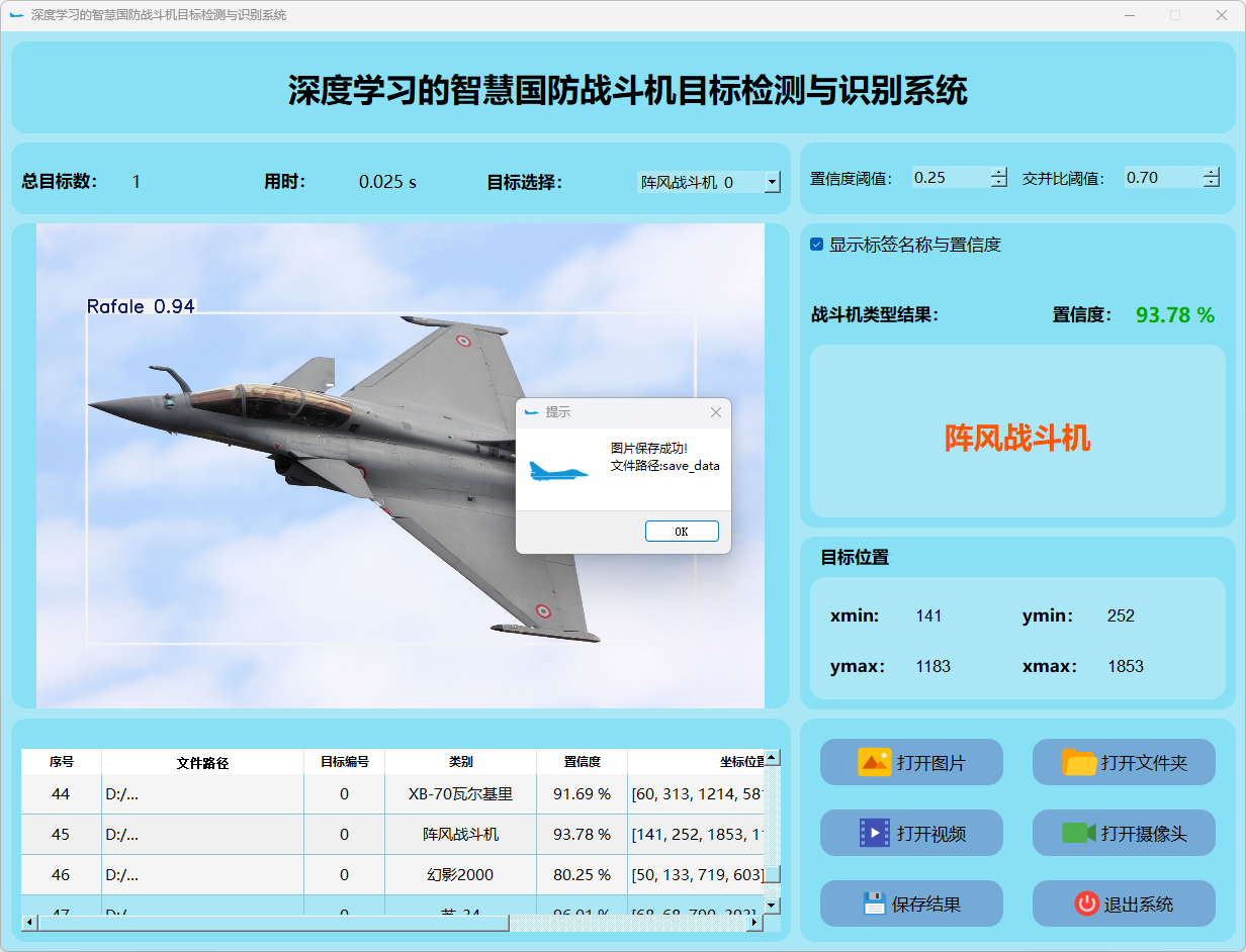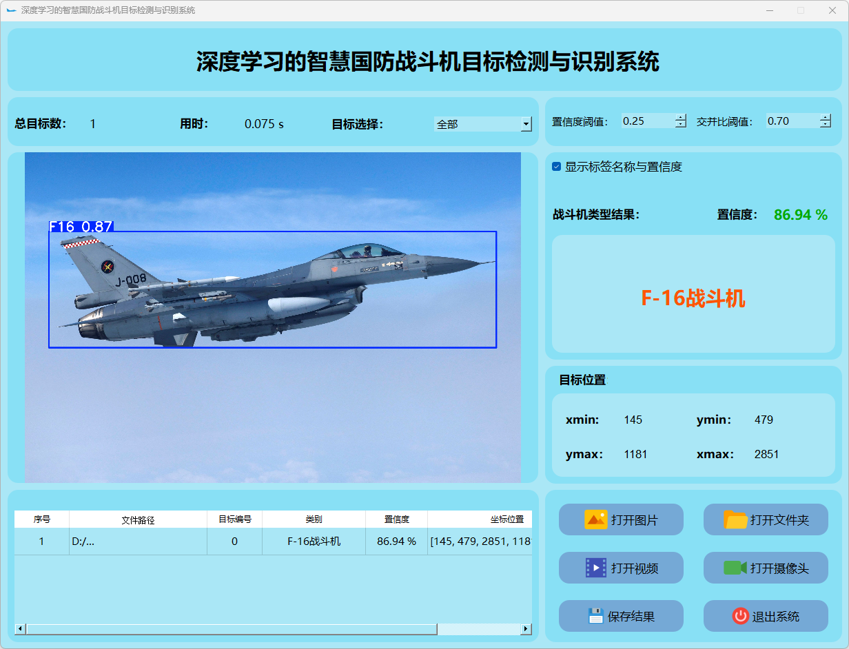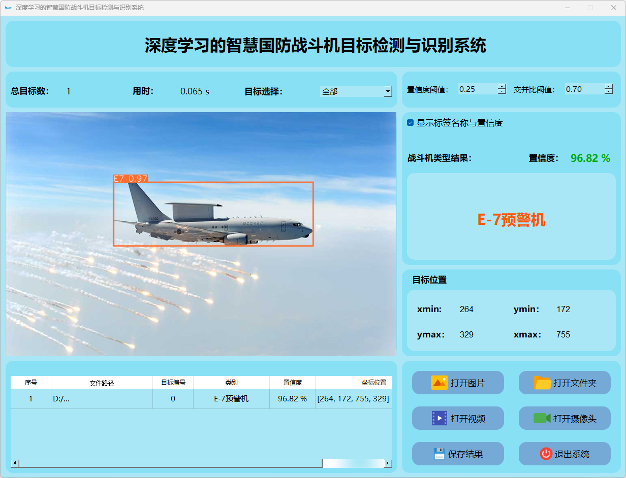 这个界面呈现了系统在视频帧中的多目标检测性能,并具备精确识别战斗机的能力;同时提供了详细的结果数据和置信度分数。