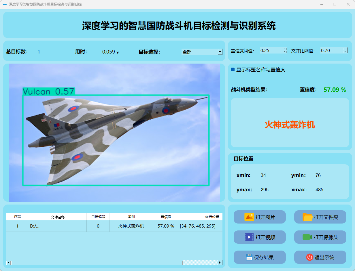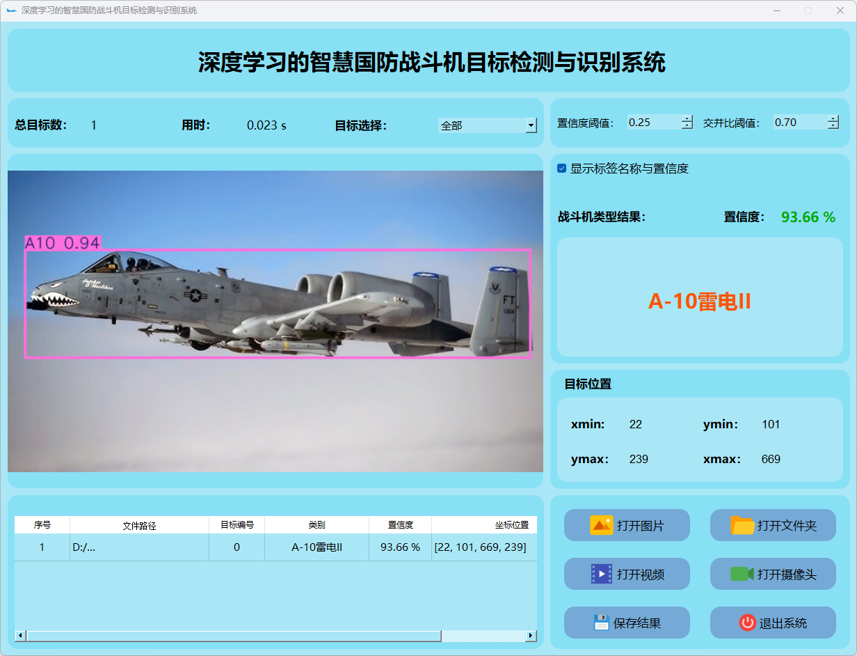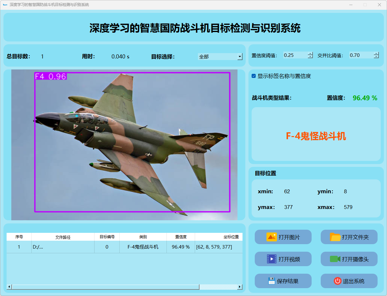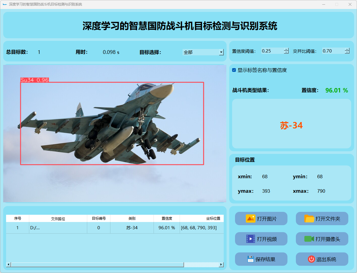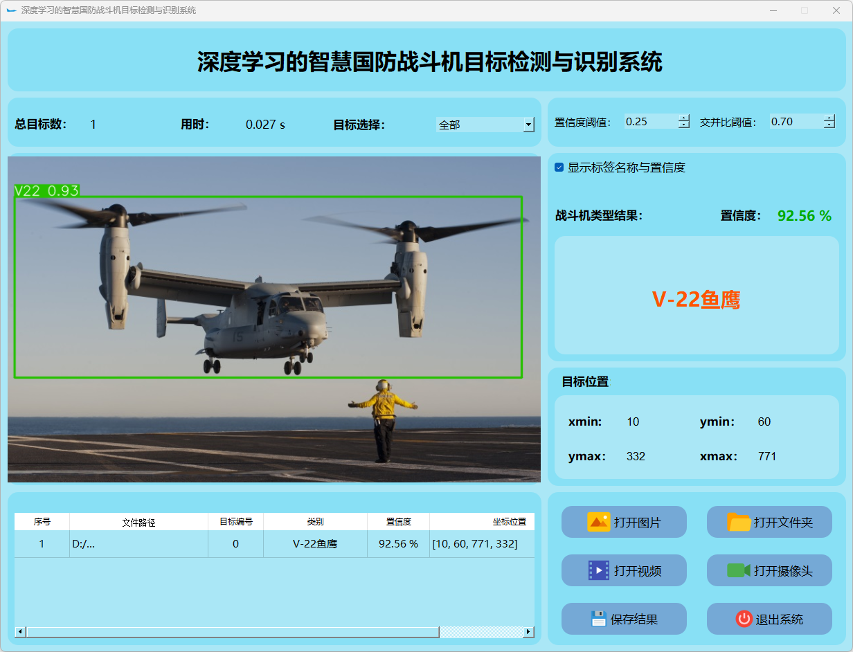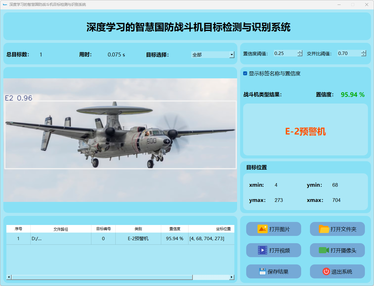 这个界面呈现了系统在视频帧中的多目标检测性能,并具备精确识别战斗机的能力;同时提供了详细的结果数据和置信度分数。