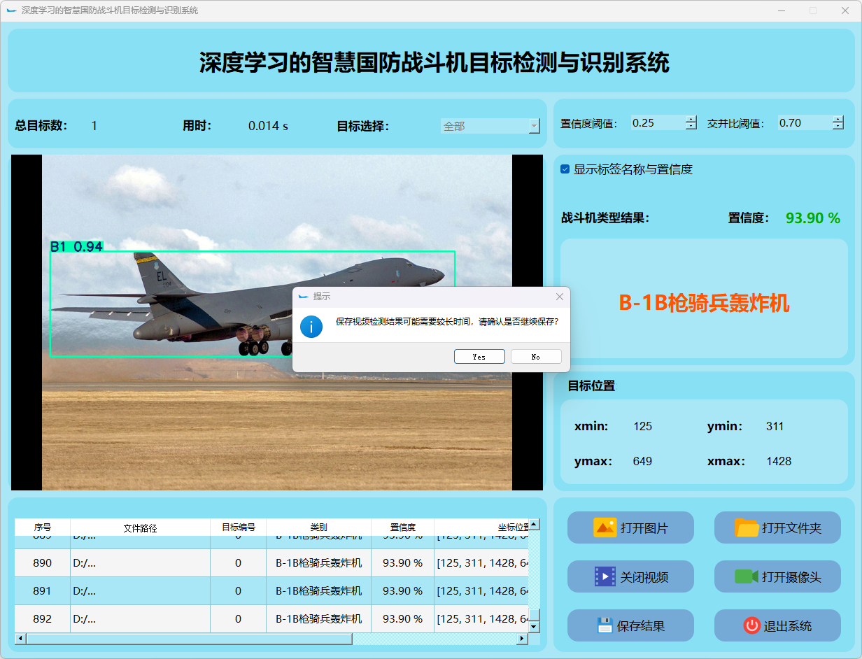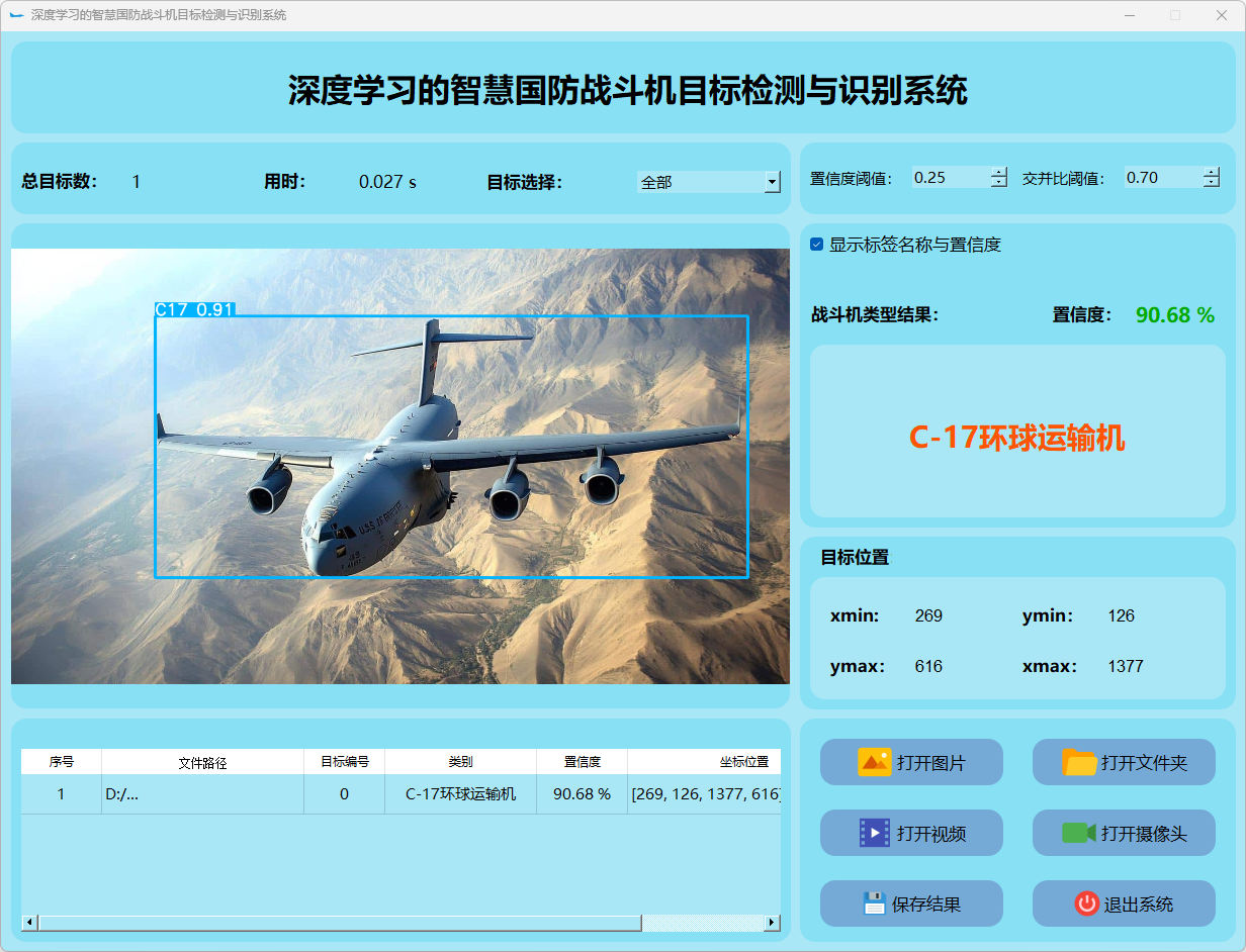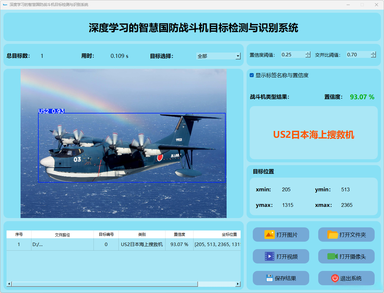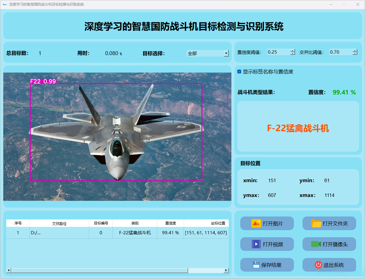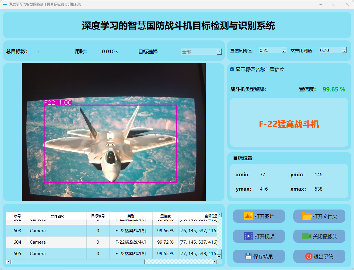 这个界面呈现了系统在视频帧中的多目标检测性能,并具备精确识别战斗机的能力;同时提供了详细的结果数据和置信度分数。