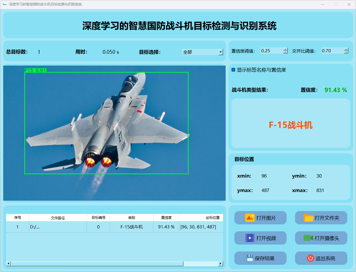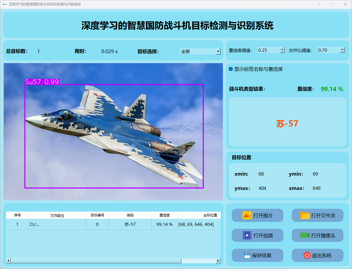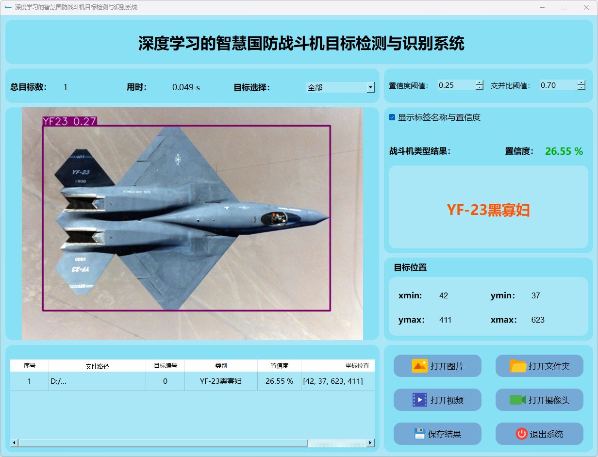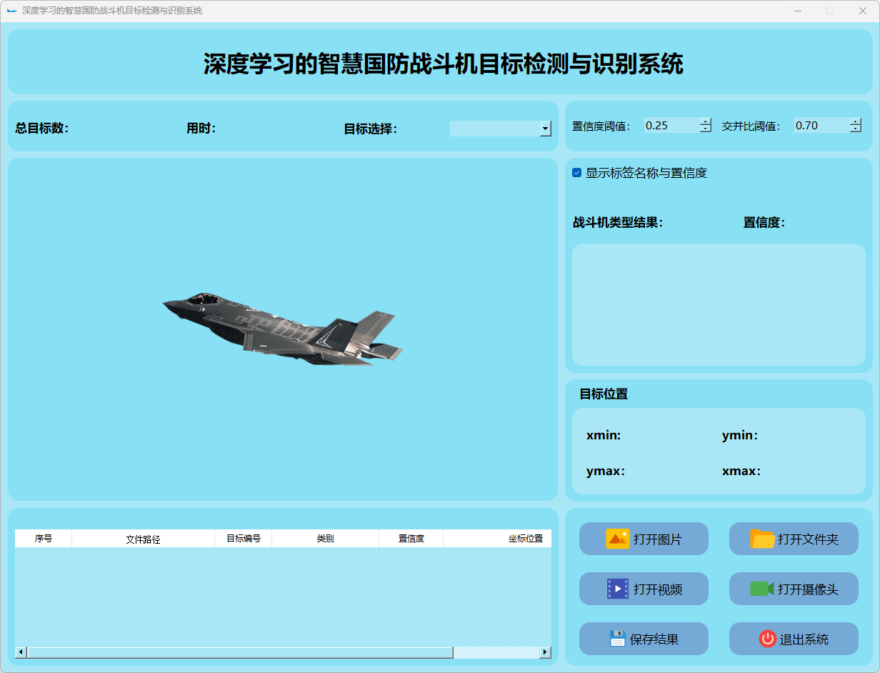 本研究还整合了基于PyQt5构建的用户界面系统。搭建了一个功能完善且易于操作的交互平台。该平台能够接受图像或视频流输入,并实时地显示检测结果。此外,在战斗机类型识别方面表现突出,并根据检测结果采取相应的应对措施。通过一系列实验和测试验证,在稳定性与效率方面均表现优异