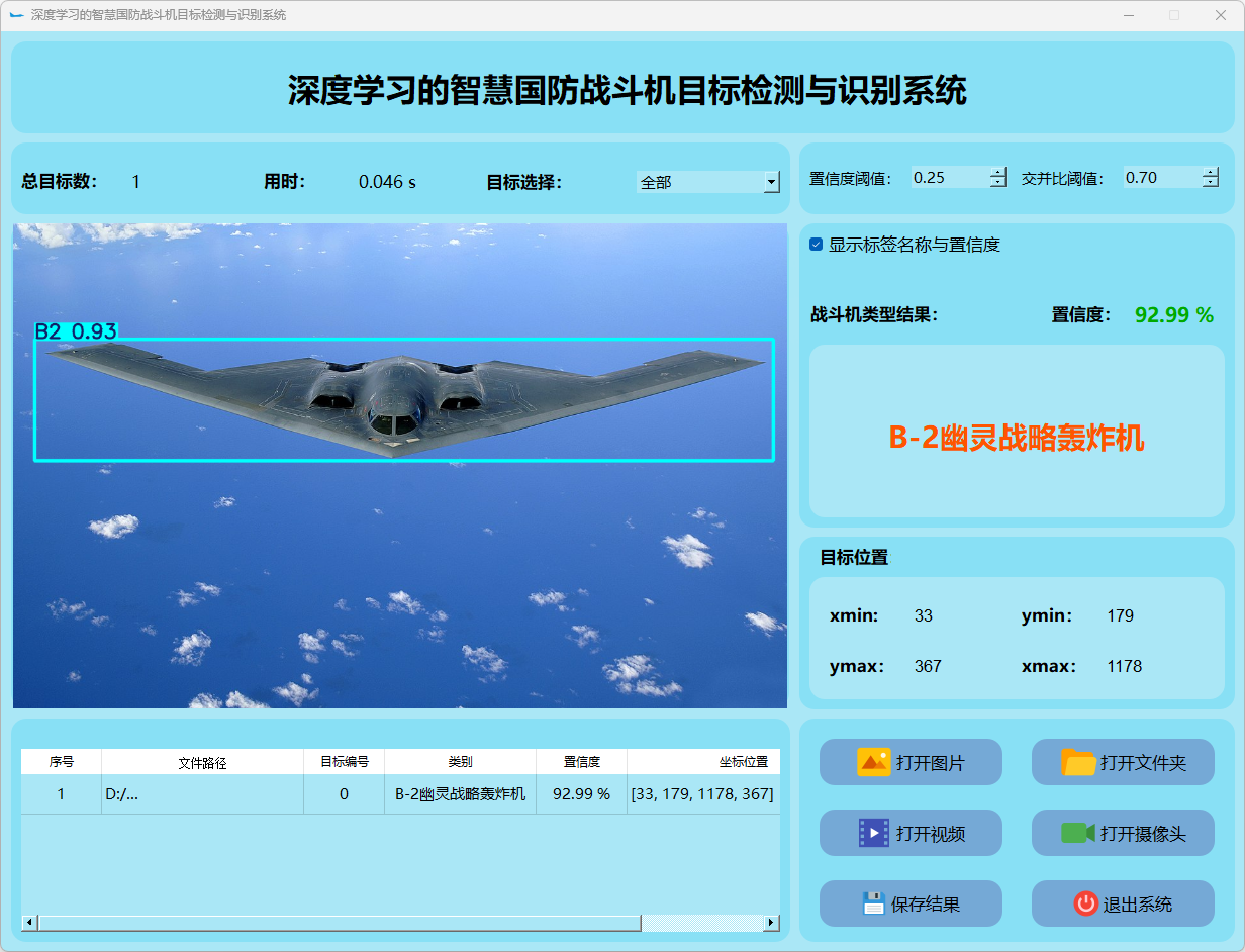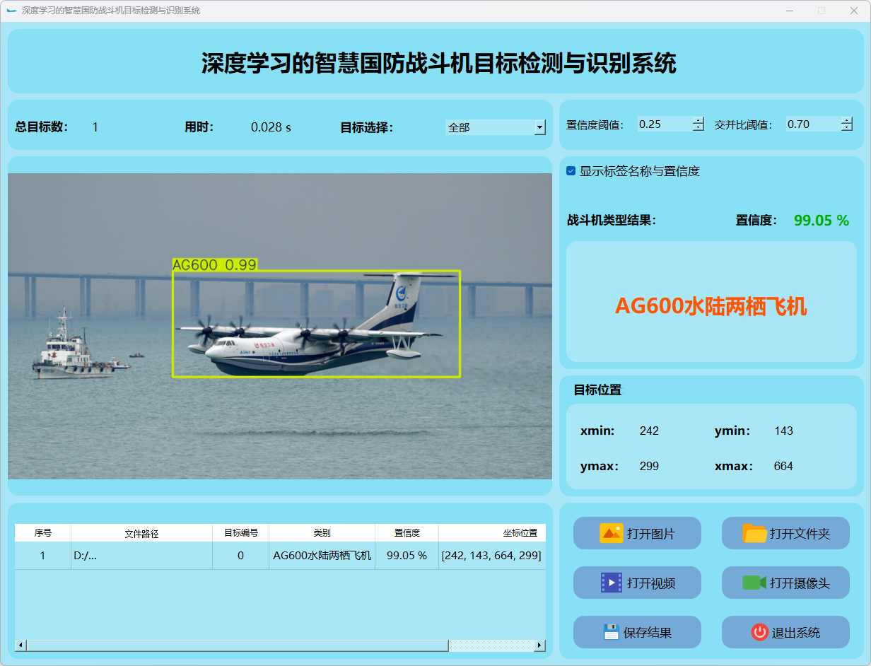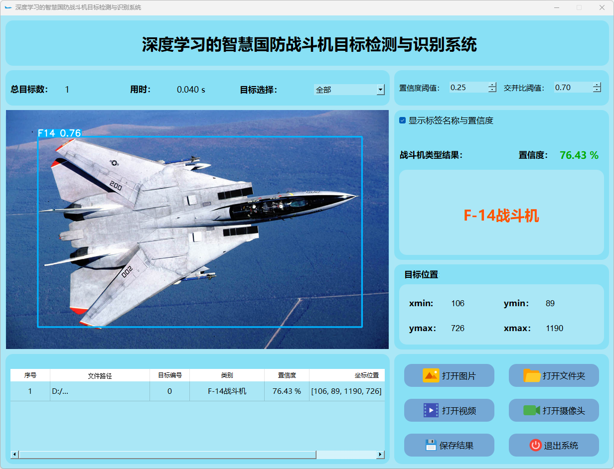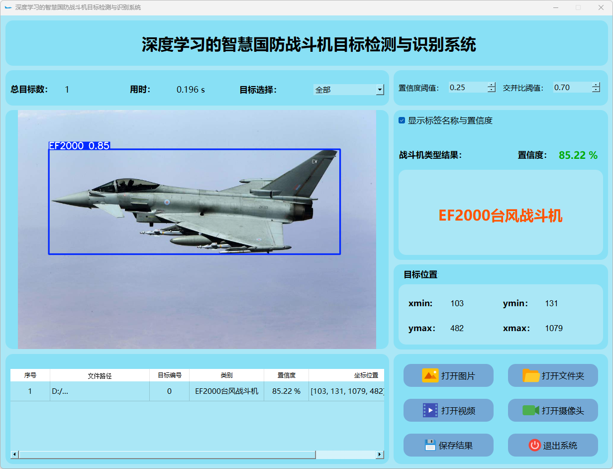 本研究还整合了基于PyQt5构建的用户界面系统。搭建了一个功能完善且易于操作的交互平台。该平台能够接受图像或视频流输入,并实时地显示检测结果。此外,在战斗机类型识别方面表现突出,并根据检测结果采取相应的应对措施。通过一系列实验和测试验证,在稳定性与效率方面均表现优异